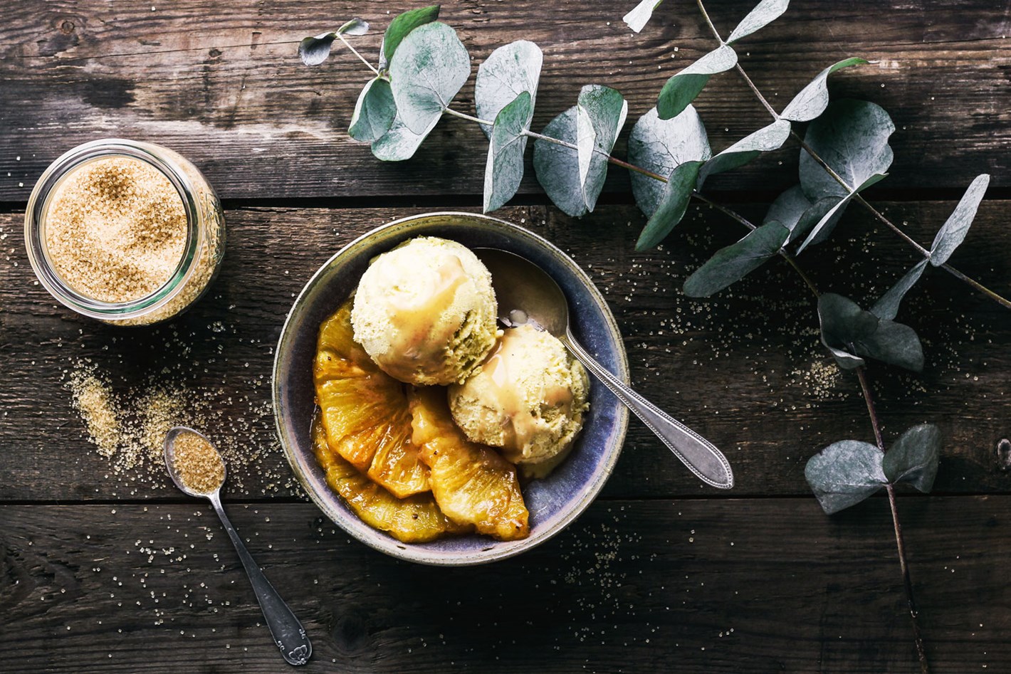 Karamellisierte Ananasscheiben mit Bourbon Vanille und Kokosnusskaramell in Schälchen anrichten und genießen.